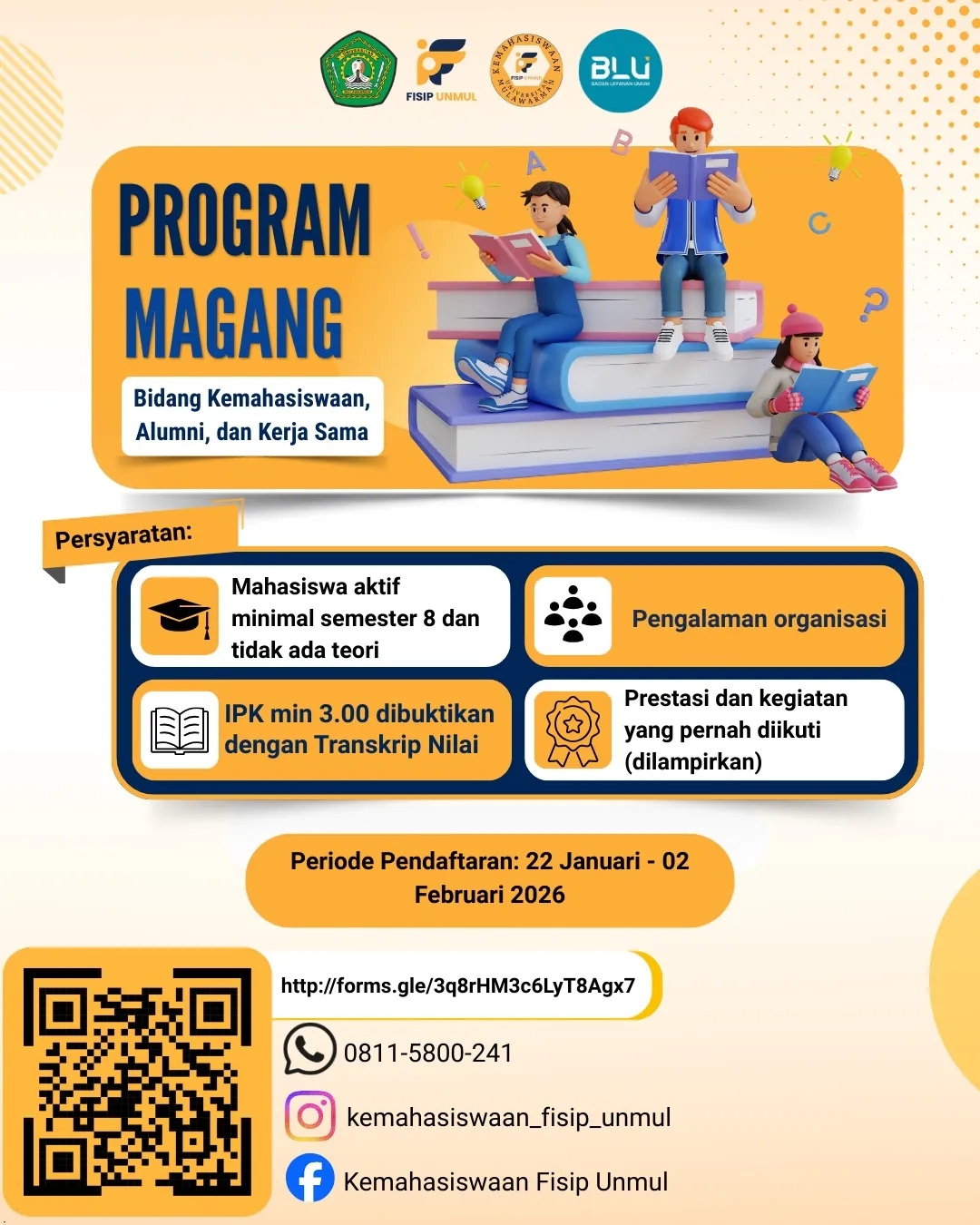 Bidang Kemahasiswaan, Alumni, dan Kerja Sama FISIP UNMUL membuka kesempatan magang bagi mahasiswa yang berminat untuk berkontribusi dalam pelaksanaan layanan dan program di lingkungan fakultas, khususnya pada bidang Kemahasiswaan, Alumni, dan Kerja Sama.